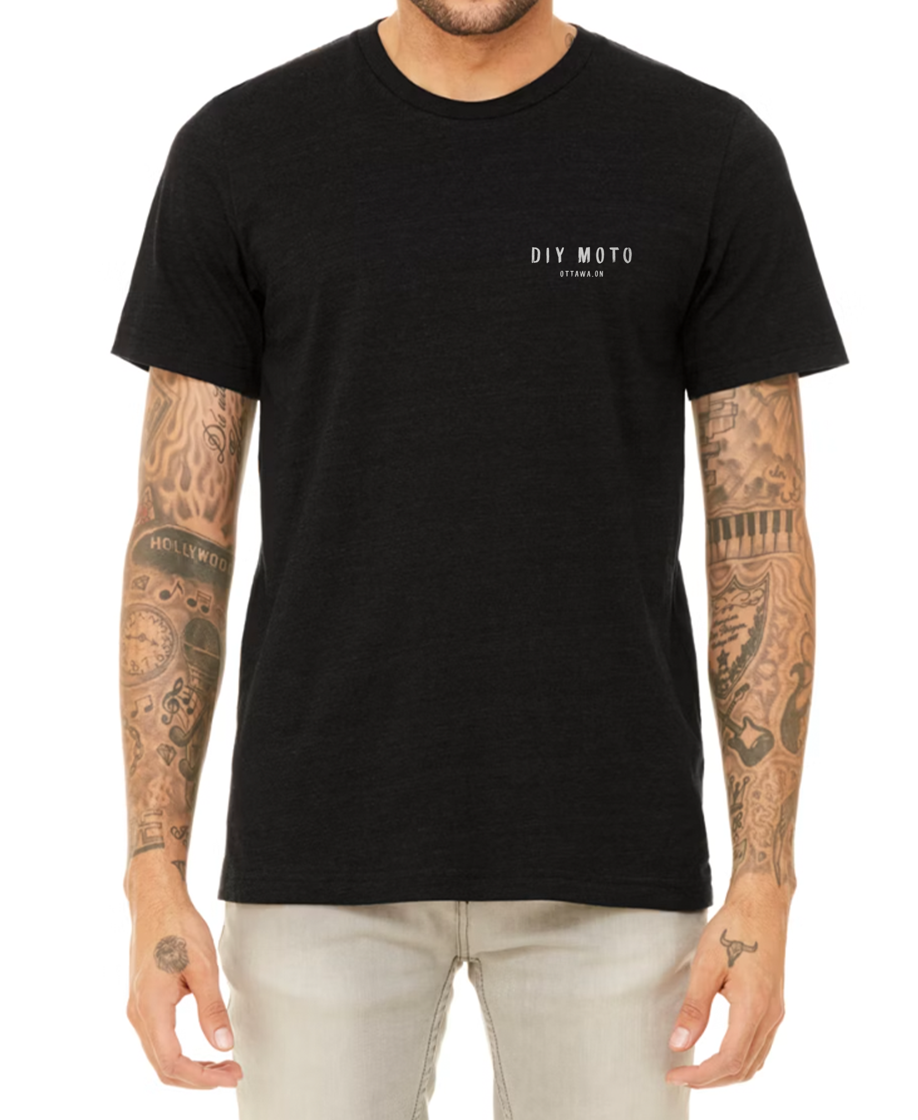This T-Shirt features a Grey screen printed DIY Moto logo, featuring Geena's 1974 Ducati 750 Sport on the back, and our DIY Moto name up front